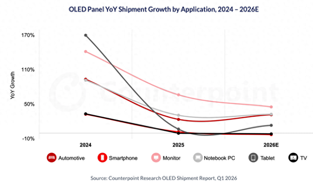 【环球网科技综合报道】4月16日消息,据市场研究机构Counterpoint Research最新报告,预计全球 OLED 面板出货量在 2025 年同比增长 3%之后,2026 年将与上一年持平。受内存成本上涨以及更广泛的零部件定价压力影响,致使 OEM 的生产和需求受限,智能手机 OLED 面板出货量同比下降了 3%。